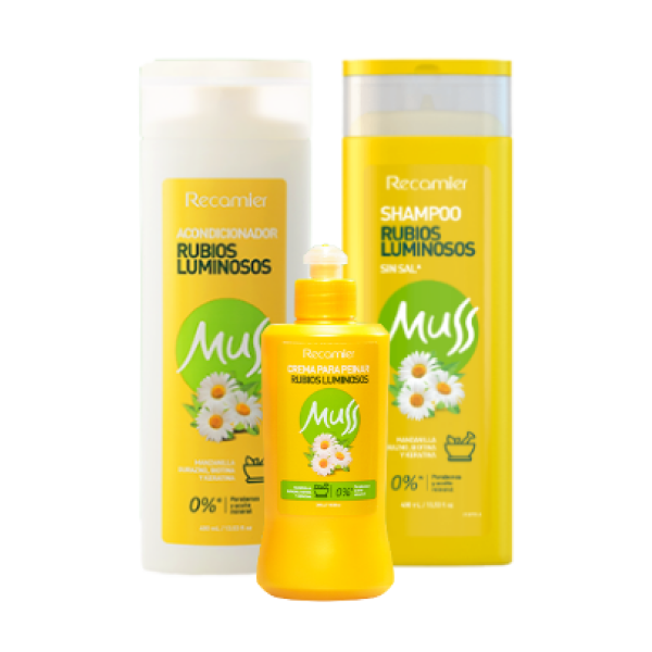 muss rubios oferta shampoo + acondicionador + tratamiento x 400 + 400 + 300 ml