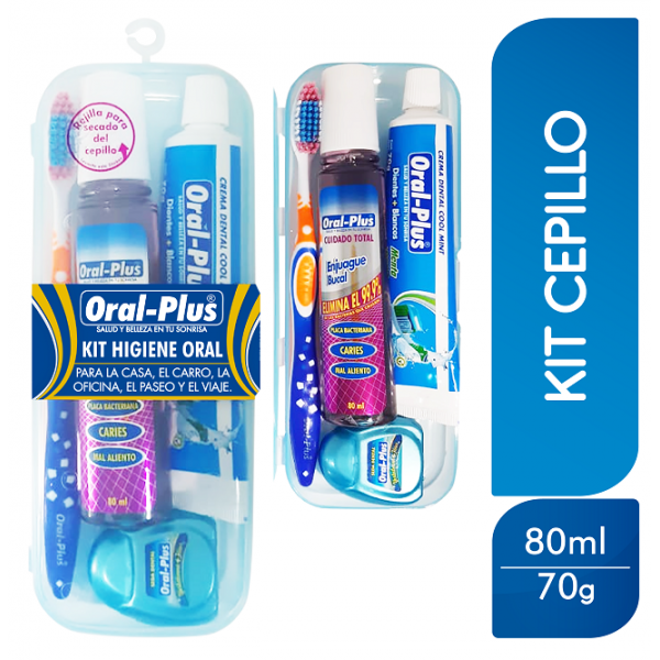 Kit viajero Oral plus cepillo + enjuague bucal 80 Ml + seda + crema dental 70 Gramos